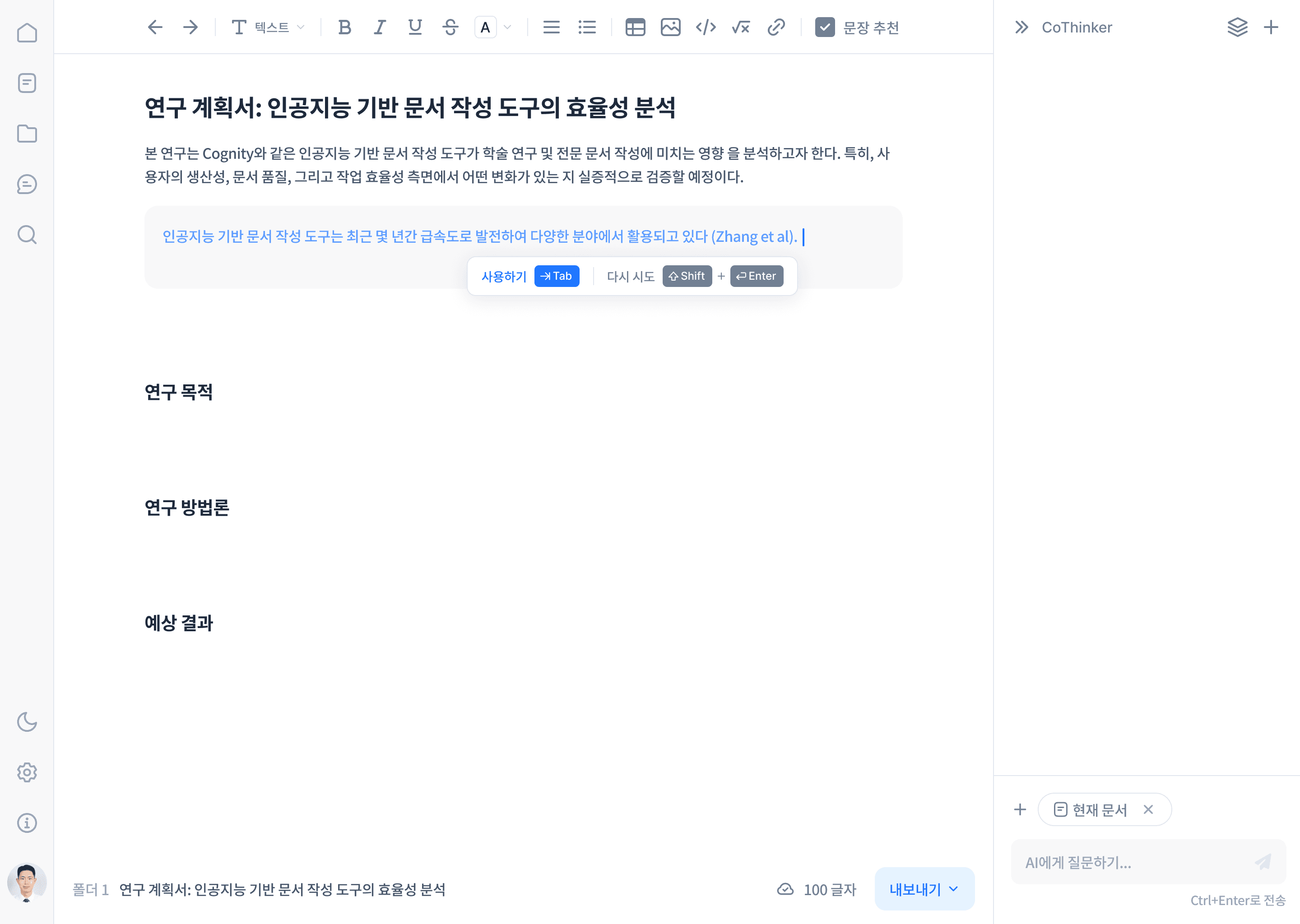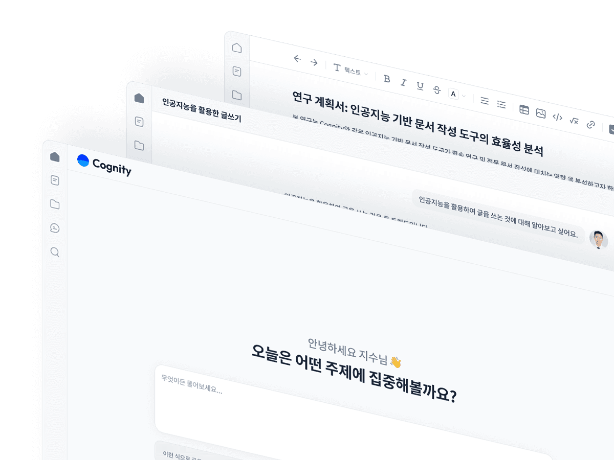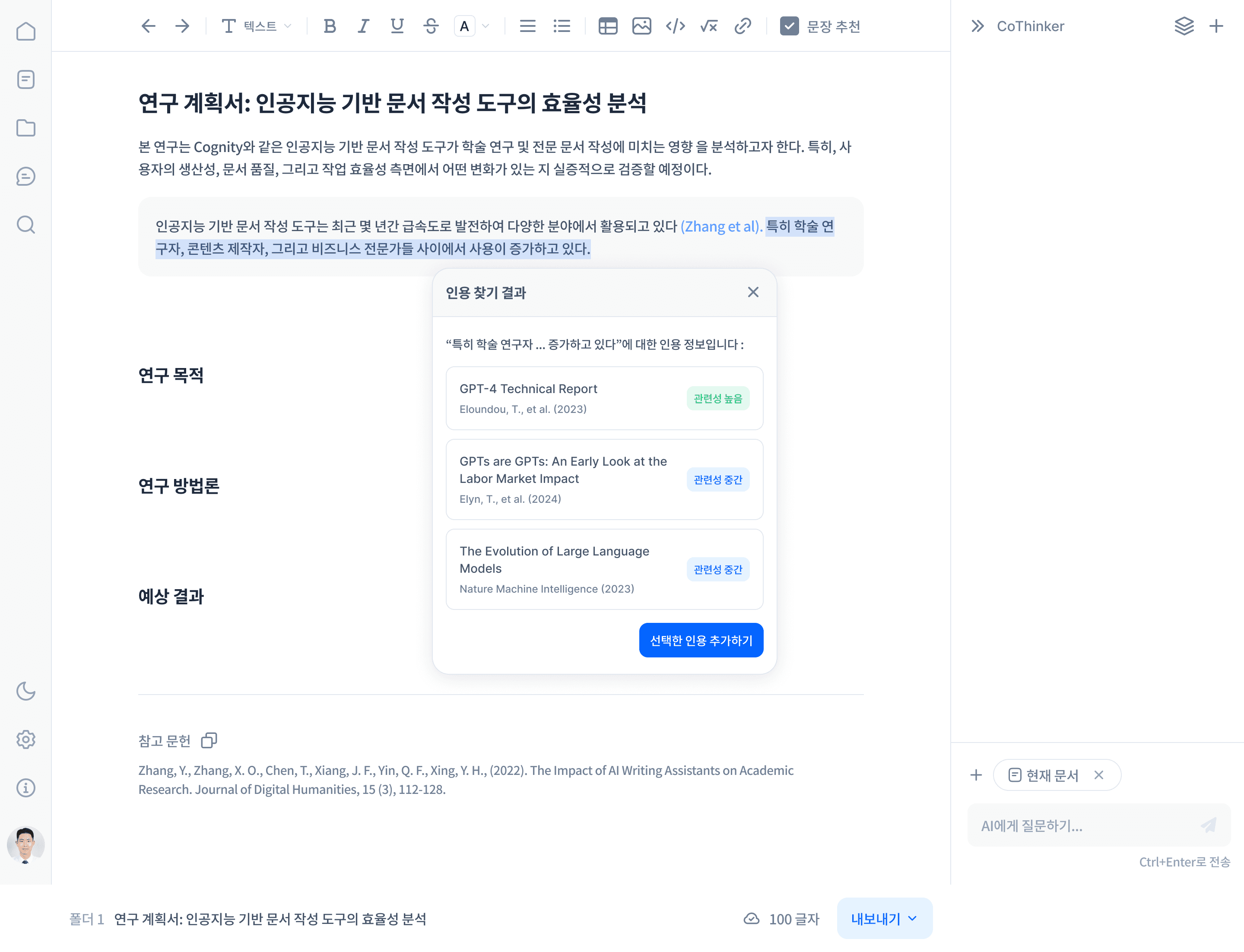 Cognity는 학술적 글쓰기에 필요한 모든 기능을 한 화면에서 제공해 인지부하를 줄여요. 한 편의 글을 완성하며, 방해 받지 않고 생각에만 몰입할 수 있도록.